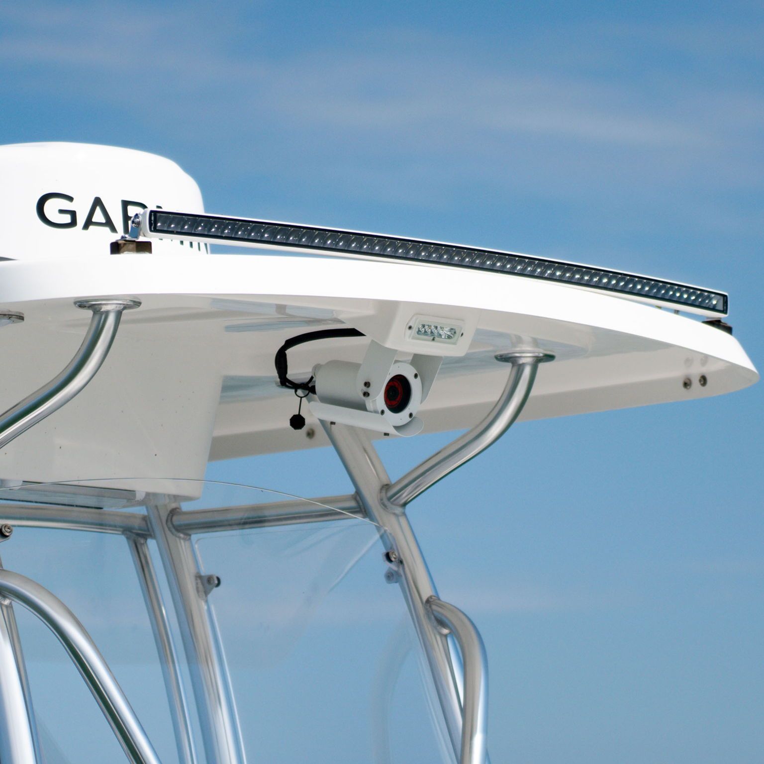 ANODIZED ALUMINUM CANVAS T TOP W/ ROD HOLDERS (4), VHF ANTENNA,